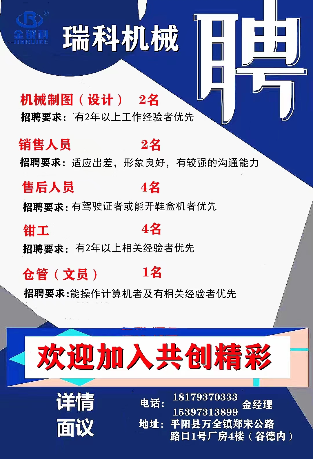 平陽瑞科機(jī)械招工啦!